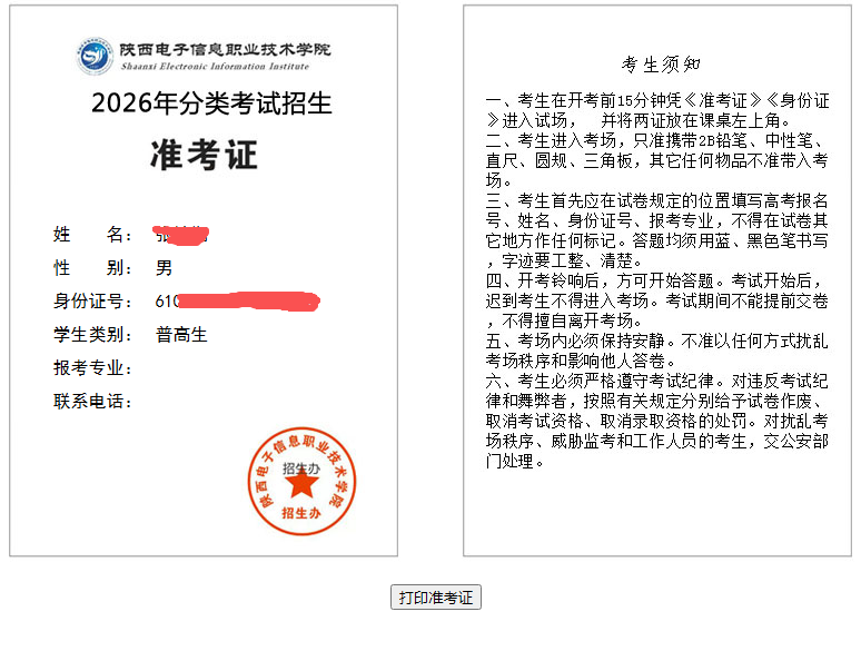 在准考证预览页面,确认信息完整后,点击页面底部的【打印准考证】按钮,完成准考证打印。