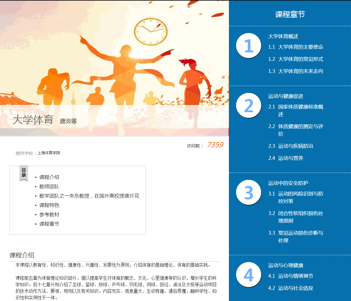 《大学体育》是我校通识教育核心课程。该门在线开放课程汇集我校优秀师资队伍,将课程内容与时代热点有机结合,运用现代信息技术手段,使体育理论讲解与示范演示无缝衔接,学生不仅能学到体育的基本理论知识、多种体育运动项目的实践技能,还能通过优美的视频领悟到体育的美感!真正打造成为一门体育与艺术相结合的精品在线开放课程。该课程上线一个月已有多所大学选修此课,选课人数达到1600人,点击量更是超过了7300人次。