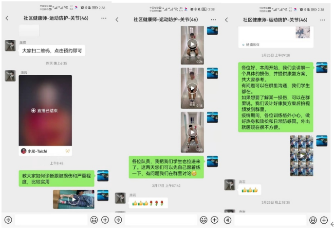运动康复教学团队吴伟老师:运用服务性学习理念探索课程线上实践教学模式。通过社区健康师工作开展在线服务学习。结合课程章节学习目标,明确学习任务。每周组织学生进行讨论,确定任务后,设计动作,进行拍摄,后期剪辑和字母处理。尽可能为学生提供线上社区学习环境。每周五将视频发至消防微信群,学生负责讲解、指导,并与消防员进行互动。社会服务结束后组织学生线上对社会实践环节进行总结反思。