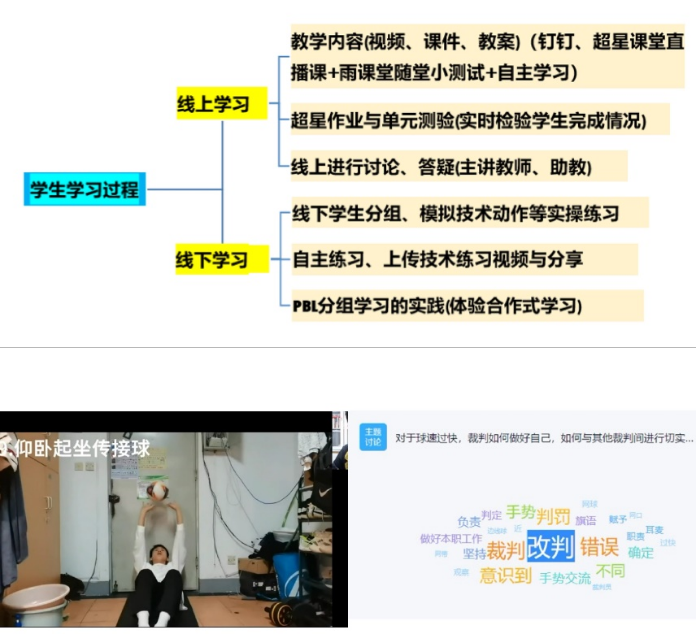 排球教学团队金贇老师:基于一致性建构原则优化线上课程设计。重构学习目标、学习活动和学习测评一致性的混合式教学模式。具体教学设计:1.常规教学方法:直播课讲授、教学视频云盘上传、自学等。2.组织学习活动:课前、课中和课后的讨论。3.课外作业:PBL分组作业和个人作业相结合。