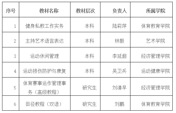 根据《普通高等学校教材管理办法》《上海市普通高等学校教材管理实施细则》《上海体育大学教材建设与管理办法》文件精神,学校启动校级教材建设工作。经教材编写团队负责人申报,二级学院推荐,教务处、研究生处组织校内外专家评审,现将上海体育大学2024年校级教材立项名单公示如下(排名不分先后):