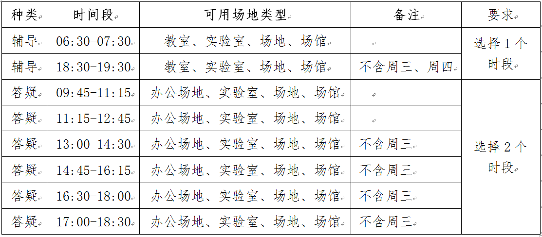 承担本学期课程的在编教师均须填报坐班答疑和自习辅导安排,各团队可结合专业和课程需要制定个性化的辅导方案,具体填报要求详见下表。