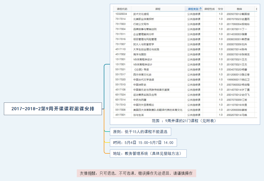 2017-2018学年第二学期第9周开课课程退课通知