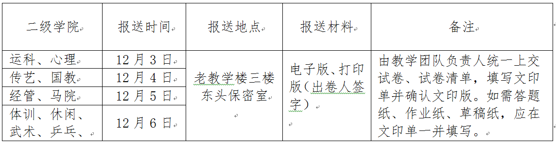 3)每门课程交两套(A、B卷)试题试卷,需报送由命题教师签名的试卷及标准答案打印版(A4、B4格式均可),以及电子版(U盘报送)。以教学团队为单位报送试卷,填写《上交试卷清单》,教学团队主任和教学副院长签字盖章后一并交本科考试中心,杜绝漏报、错报情况发生。因不按时上交试卷,影响考试工作进度,按相关规定处理。本科考试中心对上交的试卷不做任何修改。考核时由教务处本科考试中心随机抽取一套。