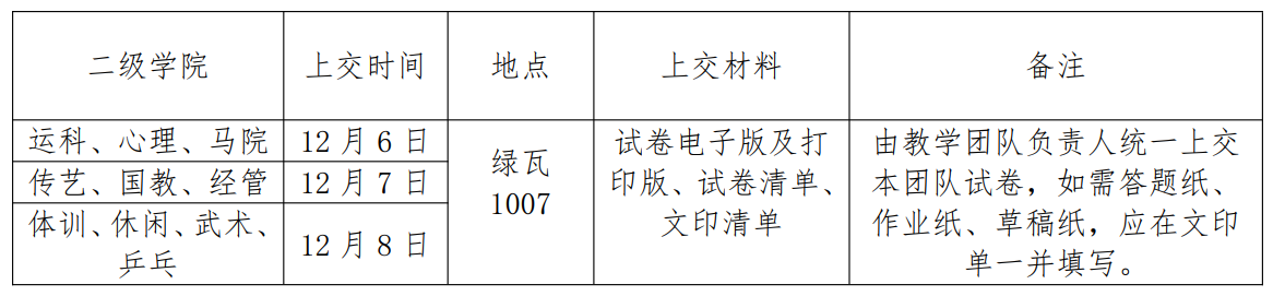 请各教学团队将考试类课程试卷报教务处本科考试中心。报送试卷请严格按照时间节点,具体安排见下表。