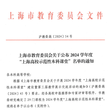 近日,上海市教委发布《上海市教育委员会关于公布2024学年度“上海高校示范性本科课堂”名单的通知》沪教委高〔2024〕54号,确定29门课程为2024学年度“上海高校示范性本科课堂”。我校运动健康学院《健康体适能评定理论与方法》(负责人:庄洁)课程入选。