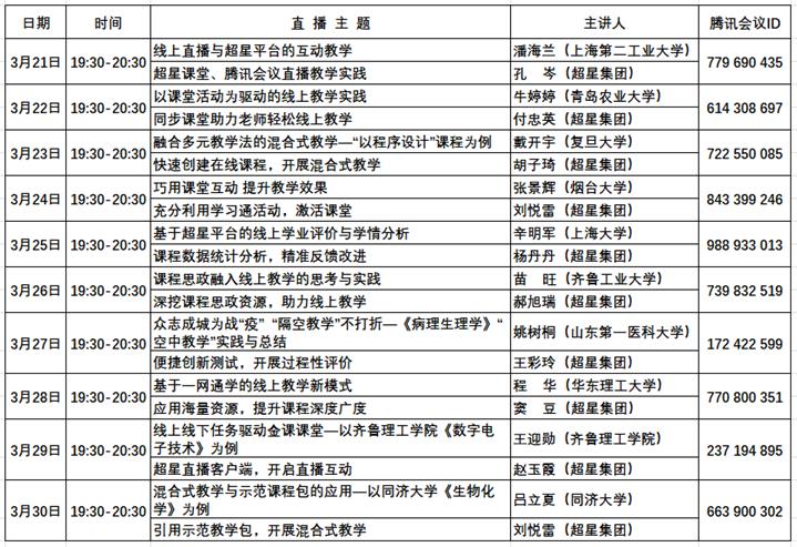 为进一步推进“互联网+教学”的教学改革,提升我校一线教师线上教学能力,推动信息技术与教育教学深度融合,保障线上教学质量,学校联合超星网络教学平台举办“在线教学经验系列分享”活动。本次“在线教学经验系列分享”活动将于3月21日—3月30日每晚19:30-20:30在腾讯会议进行直播,内容包括线上教学、混合式教学、课程思政设计等,总共10 次。每次直播将邀请一位高校资深教师做主题分享,并由一位超星集团运营经理深度讲解平台功能的具体应用。欢迎老师们积极参加!