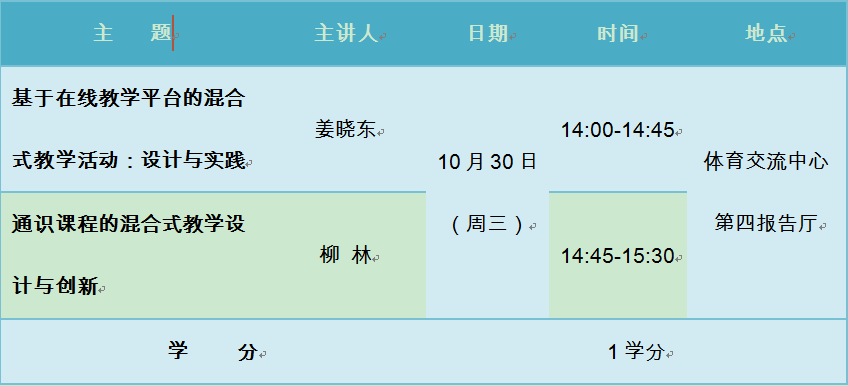 教育部在《中国慕课行动宣言》中提到:“以教师为主体推广在线学习、翻转课堂、混合式教学,改革教学内容、方法和模式。重视学习反馈与评价,促进慕课迭代,提升教学工作的有效度和教学质量的保障度。”混合式教学是采用线上主动学习+线下互动研讨的教学方式,通过线上线下一体化教学设计及丰富多彩的课堂活动设计,真正实现以学生为中心。为服务我校教师申报校级、市级、国家级混合式教学精品课程工作,掌握混合式教学的基本原理和课程设计方法,推动教学创新,优化课堂教学效果,近期中心将于10月-11月邀请复旦大学、上海交通大学、华东师范大学等高校专家来我校开设《混合式教学设计与实施》系列专题教学工作坊,现将第四讲活动具体事宜通知如下: