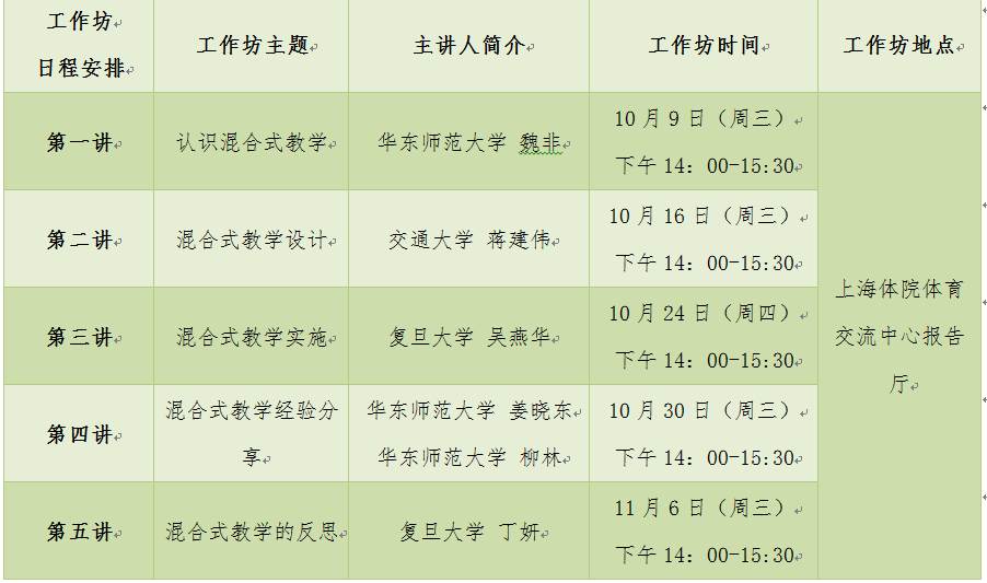 教育部在《中国慕课行动宣言》中提到:“以教师为主体推广在线学习、翻转课堂、混合式教学,改革教学内容、方法和模式。重视学习反馈与评价,促进慕课迭代,提升教学工作的有效度和教学质量的保障度。”混合式教学是采用线上主动学习+线下互动研讨的教学方式,通过线上线下一体化教学设计及丰富多彩的课堂活动设计,真正实现以学生为中心。为服务我校教师申报校级、市级、国家级混合式教学精品课程工作,掌握混合式教学的基本原理和课程设计方法,推动教学创新,优化课堂教学效果,近期中心将于10月9日至11月5日邀请复旦大学、上海交通大学、华东师范大学等高校专家来我校开设《混合式教学设计与实施》系列专题教学工作坊,具体事宜通知如下: