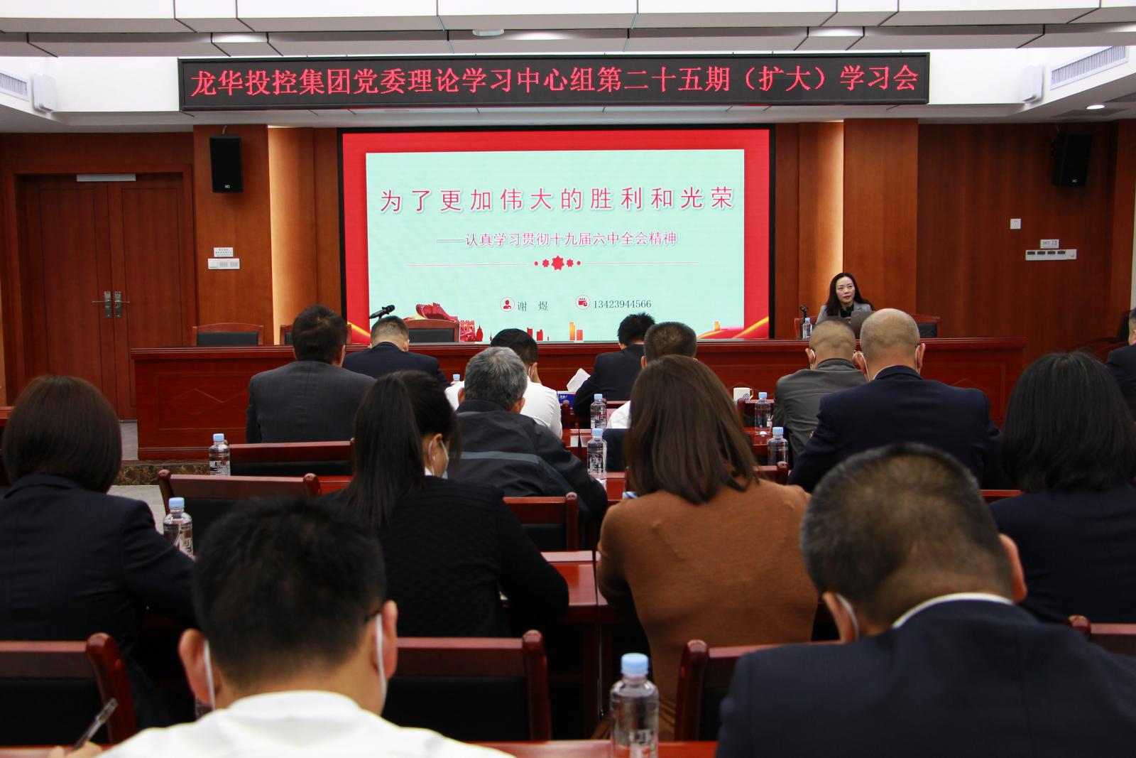 为深入学习贯彻党的十九届六中全会精神和习近平总书记在全会上的重要讲话精神,11月25日,龙华投控集团召开党委理论学习中心组(扩大)学习会议,集团领导班子成员、全体中层干部,辖属企业党政班子成员及党员干部职工等参加学习,会议由集团党委专职副书记金鹏同志主持。