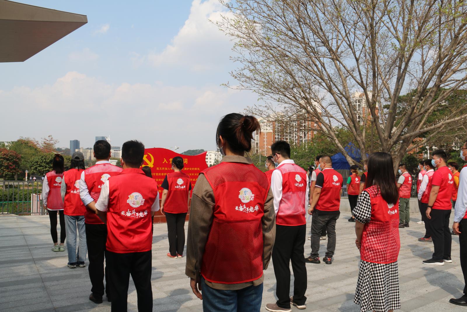 龙华投控集团疫情防控青年突击队集结在集团党群V站奋斗者广场前,全体队员佩戴党徽,举起右手、握紧拳头,重温入党誓词,庄重宣誓,以更加饱满的热情投身到疫情防控工作中。