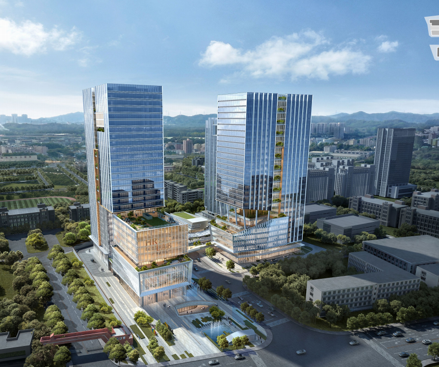 项目采用“南北双塔”布局,南塔建筑面积约6.97万平方米,以研发办公为主。标准层每层面积约2000平方米,空间可灵活分隔,实现企业间的有效互动。