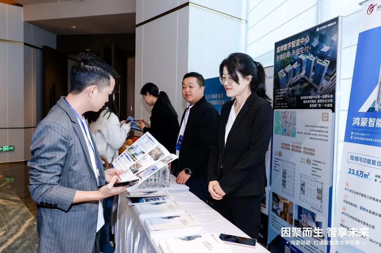 此外,会议室场外的科技体验区成为大会的人气焦点。其中,龙华投控集团的招商展台前人头攒动,众多企业代表前来咨询,对鸿蒙智能终端产业园项目表现出浓厚的兴趣。