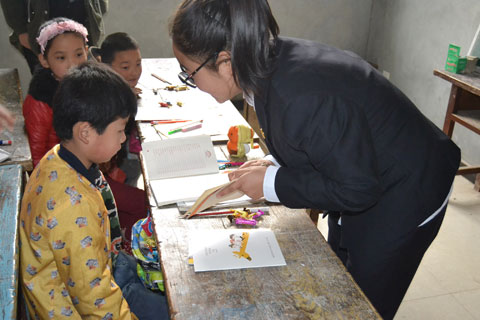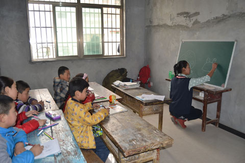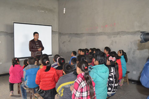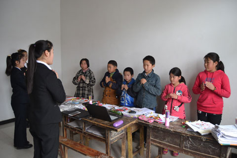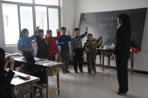 下午一点整,爱心学生代表一行驱车赶往活动现场。(杨家斜小学位于蓝田县普华镇南三公里处)。全校共62名学生,以留守儿童为主,本次支教活动对象是三年级、四年级、五年级,支教科目包括语文、外语、美术、体育、多媒体教学等。根据杨家斜小学领导的安排,各组同学分工明确、配合融洽、课堂氛围活跃。