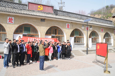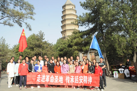 4月1日上午参观了宝塔山、杨家岭和枣园。宝塔山是延安革命圣地的重要标志和象征,全体党员在塔前进行合影留念。