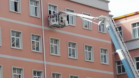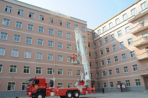 16时整,根据制定的演练方案,消防演练正式开始,火情警报启动后,校园安保巡逻队迅速进入事发地点,蓝田消防支队驾驶消防车随后赶到,第一时间组织人员进行疏散,用高压水枪对事发教室进行灭火,用担架将伤员抬出,并对五楼教室无法疏散的被困人员利用云梯将其救出,整个演练过程进展顺利。在演练结束后,蓝田县消防官兵给师生讲解了逃生技巧和灭火器的使用方法。