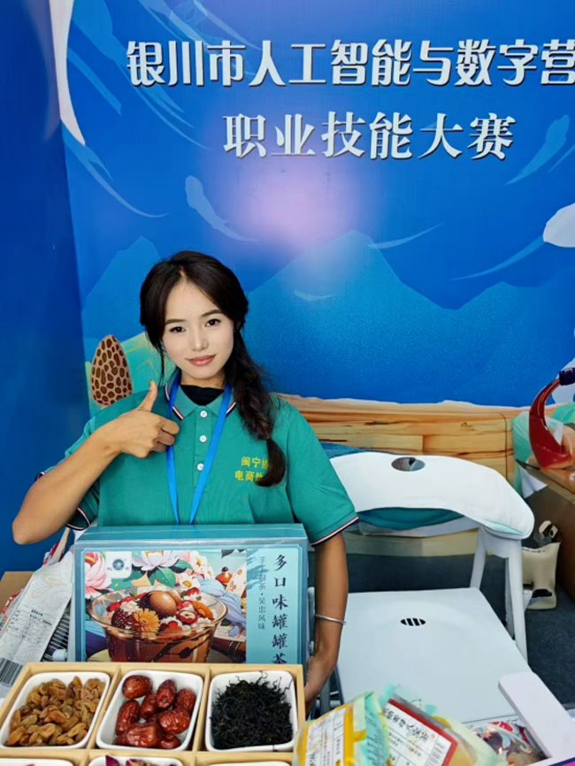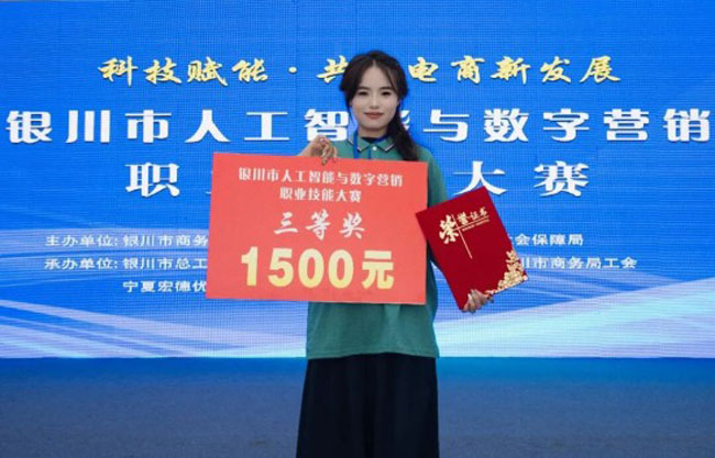 实习期间,苏梅凭借扎实的专业基础和积极的学习态度,很快得到当地政府的重视与重点培养。得知她的电子商务专业背景后,闽宁镇政府主动为她报名参加《银川市人工智能与数字营销职业技能大赛》。她不负众望,最终荣获三等奖,并获得1500元奖金。这份荣誉不仅是对她个人能力的肯定,更成为陕电职院电子商务专业人才培养质量的鲜活注脚。