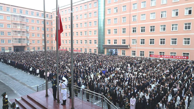 伴随着雄壮激昂的《义勇军进行曲》,护旗手迈着整齐有力的步伐护送国旗至旗杆下,五星红旗在全体师生的注目礼中缓缓升空、迎风飘扬。