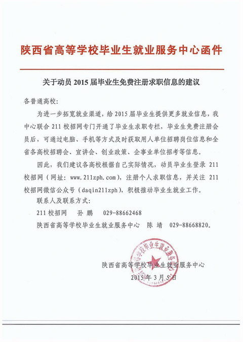 转发教育厅关于2015届毕业生免费在211校招网站注册求职信息的通知