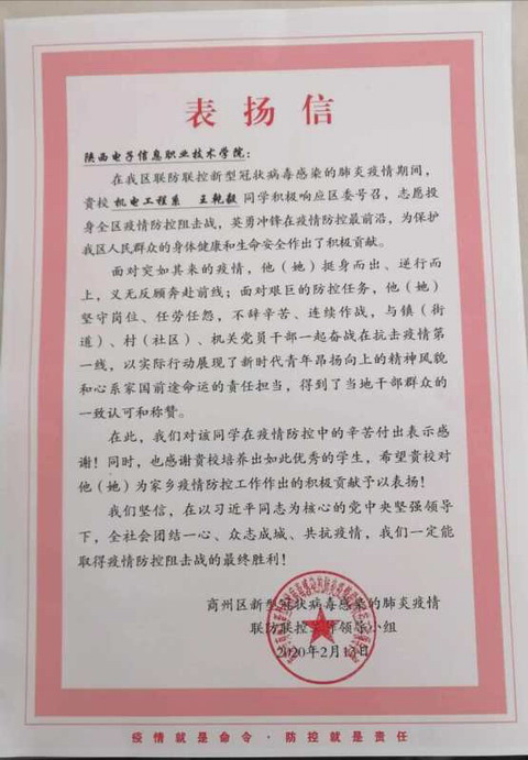 王乾毅同学系我院2018级机电一体化专业1804班学生,预备党员、团委学生干部,在校学习成绩优异表现良好。这这次战疫中积极响应当地区委的号召,志愿投入到疫情防控最前沿。在陕西省商洛市商州区三岔河镇灯塔村移民搬迁小区疫情防控工作期间,该同学负责社区疫情防控摸排工作,并进行疫情宣传,对于必要出入的车辆和人,检查其通行证并进行信息登记和体温测量,积极为社区服务,为社区群众消毒、填写出入人员信息,尽自己最大的努力为社区服务。投身全区疫情防控阻击战,英勇冲锋在疫情防控最前沿,为保护人民群众的身体健康和生命安全作出了积极贡献,面对突如其来的疫情,他挺身而出、逆行而上,义无反顾奔赴前线;面对艰巨的防控任务,他坚守岗位、任劳任怨,不辞辛苦、连续作战,与街道、社区、机关党员干部一起奋战在抗击疫情第一线,以实际行动展现了新时代大学生昂扬向上的精神风貌和心系家国前途命运的责任担当,得到了当地干部群众的一致认可和称赞。