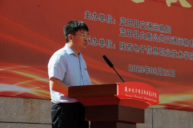 王明星在致辞中指出,校园直通车既是学院的窗口,也是校园一抹靓丽的风景线,是学院坚持以师生为本,践行“我为群众办实事”,提高后勤保障、服务师生的具体体现。校园直通车的开通,充分体现了蓝田县交通运输局和蓝田县白鹿公共交通运输有限公司支持教育、关爱师生、尊重人才的优秀企业文化和崇高的社会责任感,希望全体师生文明出行,共同营造安全、文明、有序的交通环境。