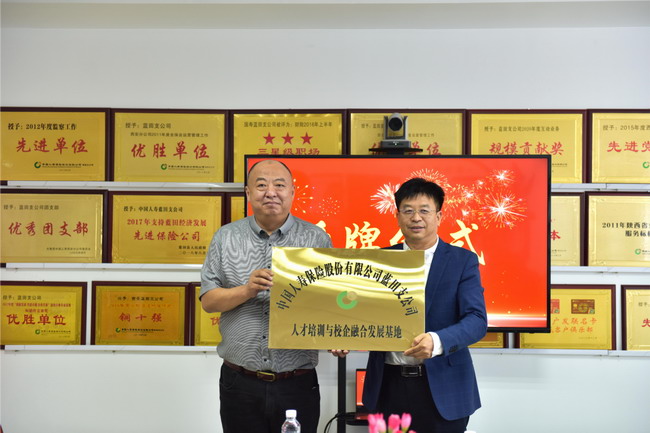 会上,蓝田支公司为我校颁发了“人才培训与校企融合发展基地”牌匾,决定将我校作为保险人才培训与校企融合发展建设基地。