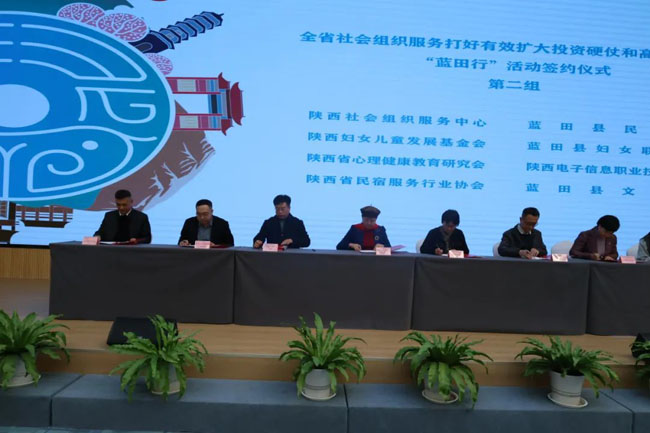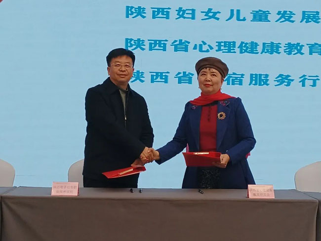 3月13日下午,在全省社会组织服务打好有效扩大投资硬仗和高质量发展“蓝田行”活动中,陕西电子信息职业技术学院与陕西省心理健康教育研究会签署“阳光心理教育品牌项目”战略合作协议。这一合作标志着学院在大学生心理健康教育领域迈出了新步伐,为青年学子心理健康发展注入了专业力量。理事长、院长王明星,陕西省心理健康教育研究会会长宋馨出席并参加签约仪式。