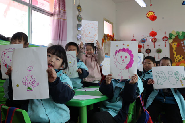 在绘画课堂上,志愿者们耐心细致地引导小朋友们拿起彩笔,描绘心中美好的世界。小朋友们眼睛亮晶晶的,小手紧紧握着画笔,在画纸上大胆涂抹,不一会儿,一幅幅充满童趣与想象力的画作便诞生了,五彩斑斓的画面满是纯真。