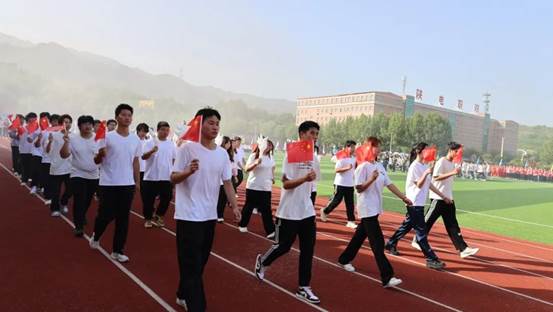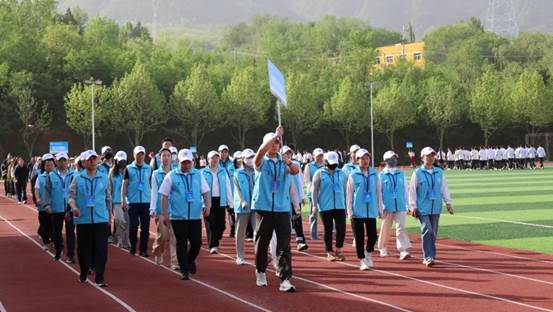 在激昂的《运动员进行曲》中,国旗护卫队迈着铿锵有力的步伐护送国旗入场。他们身姿挺拔、目光坚定,每一步都踏出了蓬勃的朝气与使命感 ,鲜艳的五星红旗在阳光下熠熠生辉。随后,彩旗方队挥舞着五彩斑斓的旗帜紧跟其后,猎猎彩旗如波浪翻涌,彰显着青春的热烈与奔放。志愿者方队、教工裁判队依次走过主席台,他们精神饱满,用灿烂的笑容和整齐的步伐展现着奉献精神与专业态度。