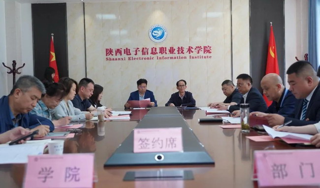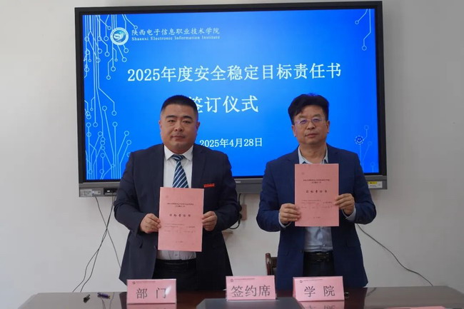 4月28日,陕西电子信息职业技术学院举行2025年度安全稳定目标责任书签订仪式。理事长、院长王明星出席,党委书记石光华作总结讲话,副院长年小望主持仪式。副院长李泽宇、石晓英,副院级巡视员陆晓珂、田志岗、杜晓科及各职能处室负责人共同参加。