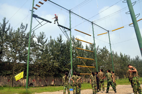 “好高啊!”当队员们看到高空断桥时都发出惊呼。在距离地面9米的高空搭着一座独木桥,桥的中间却是断开的,间距约1.2-1.2米,队员必须爬上9米的高空后,从一侧迈过另一侧,再从另一侧迈回来,最后原路返回,而桥上队员身上的唯一的保险绳掌握在地面队员的手中。面对9米的高空,很多队员有着本能的恐惧,但是训练必须进行,队员们相互鼓励着,仔细地检查着上桥队员身上的安全装备。当一名队员上去的时候,安保队员目不转睛地盯着他的一举一动,随时调整手中保险绳的长短,而其他队员一起为他加油。当队员从桥上下来后,其他队员纷纷上前拥抱、击掌庆祝。下来的队员鼓励下一位队员:“别怕,没事儿,我不也好好的下来了吗!放心吧!”最后,队员们都克服了自己的心理障碍,充分相信自己的队员,完成了这项挑战。
