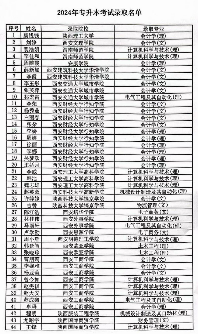 2024年陕西省普通高等学校专升本招生录取已经结束。我院学子在2024年专升本考试中再创佳绩。据统计,今年我校专升本录取44人,专升本报考录取率67%,其中录取人数与报考录取率双双再创历史新高。学生被陕西理工大学、西安文理学院等19所本科院校录取。