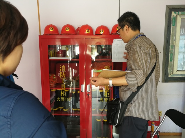 检查组人员检查园区消防工具柜用具是否齐全。