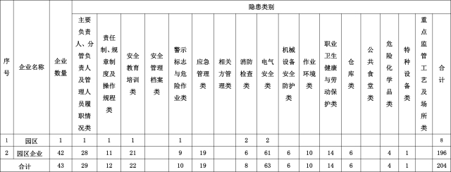 此次检查发现,园区管理处存在安全隐患8处。检查园区企业共42家,发现安全隐患196处。其中,用电安全、未对员工开展安全教育或教育材料缺失、应急管理工作不到位、无安全管理人员且未建立安全管理制度及相关安全工作记录等问题突出。详情见下表: