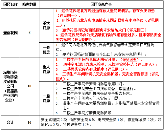 11月22日,投资管理公司刘副总、中科安全公司安全专家等一行人前往迎侨花园和德盛昌产业园进行消防安全大排查专项行动,发现隐患16项(处),其中:安全管理类2项 消防安全类8项 电气安全类1项,作业环境类2项,涉危化品2类,特种设备类1类(详情见表1.1、图1.1)。