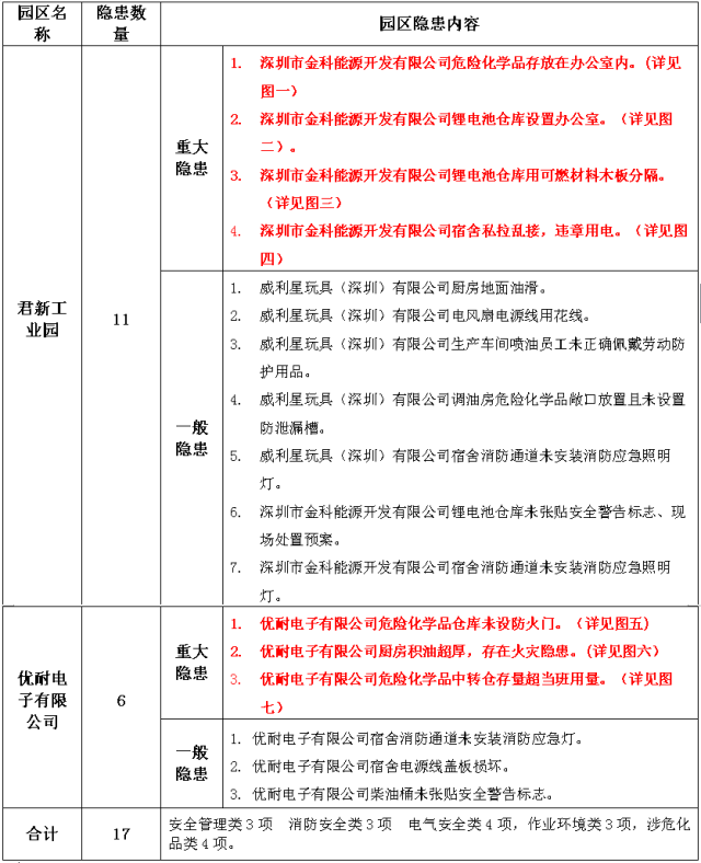 1.君新工业园深圳市金科能源开发有限公司危险化学品存放在办公室内,锂电池仓库设置办公室,锂电池仓库用可燃材料木板分隔,宿舍私拉乱接,违章用电。