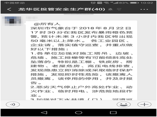 深圳市气象台于2018年8月22日17时30分在龙华区发布暴雨橙色预警,预计未来 3 小时内我区将出现 50 毫米以上降水, 龙华投管公司立即通过安全微信群下发相关通知,并要求各辖属企业停止室外作业,加强边坡,危墙,井口等位置的巡查,及落实安排负责人带班应急值守工作。
