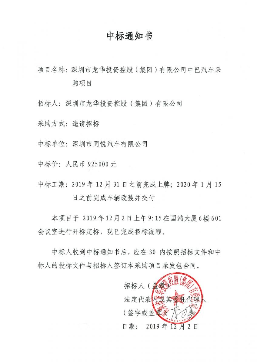 中巴汽车采购项目中标通知书公示期:2019年12月2日-2019年12月3日。