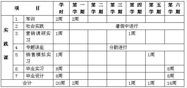 毕业实习是高职院校人才培养方案和教学计划的重要环节,通过毕业实习增强学生对社会的感性认识,强化职业技能,提高专业知识的综合运用能力。企业对营销人才要求较高,特别强调营销实践经验和营销经历,因此,组织营销专业毕业生进行毕业实习,积累营销经验,可以提高就业竞争力,真正做到零距离就业。毕业实习为二至三个月,以实习单位加盖公章的学生提交的实习报告作为考核依据。